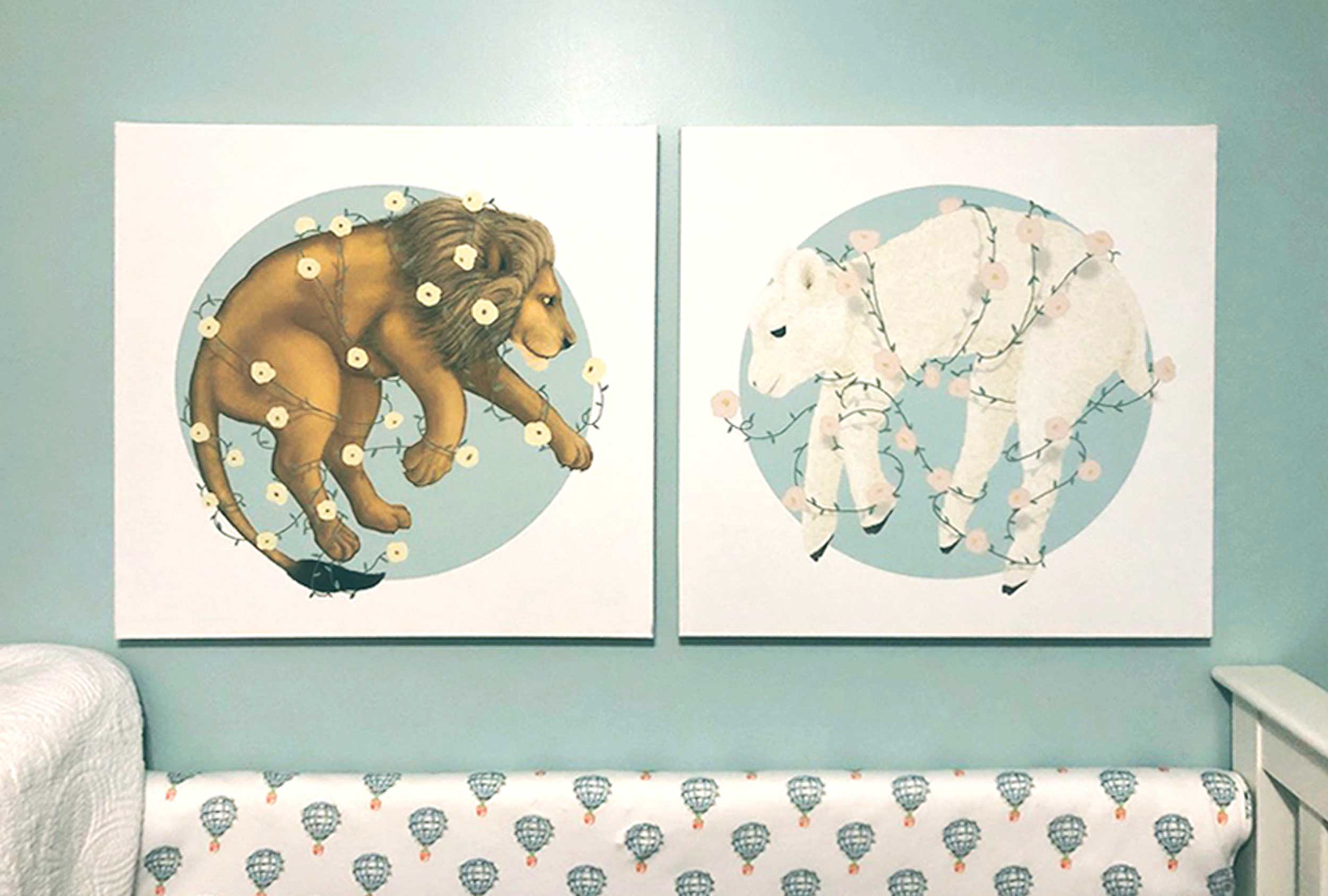 I illustrated these animals shortly after my first son's arrival to the world. They were a big part of the inspiration behind Heyward House. I wanted something delicate and sweet to go in my son's nursery. I wanted to do complimentary animals such as lion and lamb, etc.